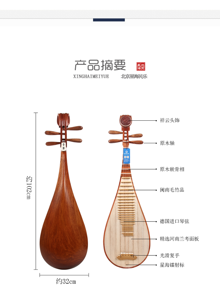 商品名称:星海琵琶乐器89119大果紫檀木材质原木抛光工艺祥云头饰专业琵琶