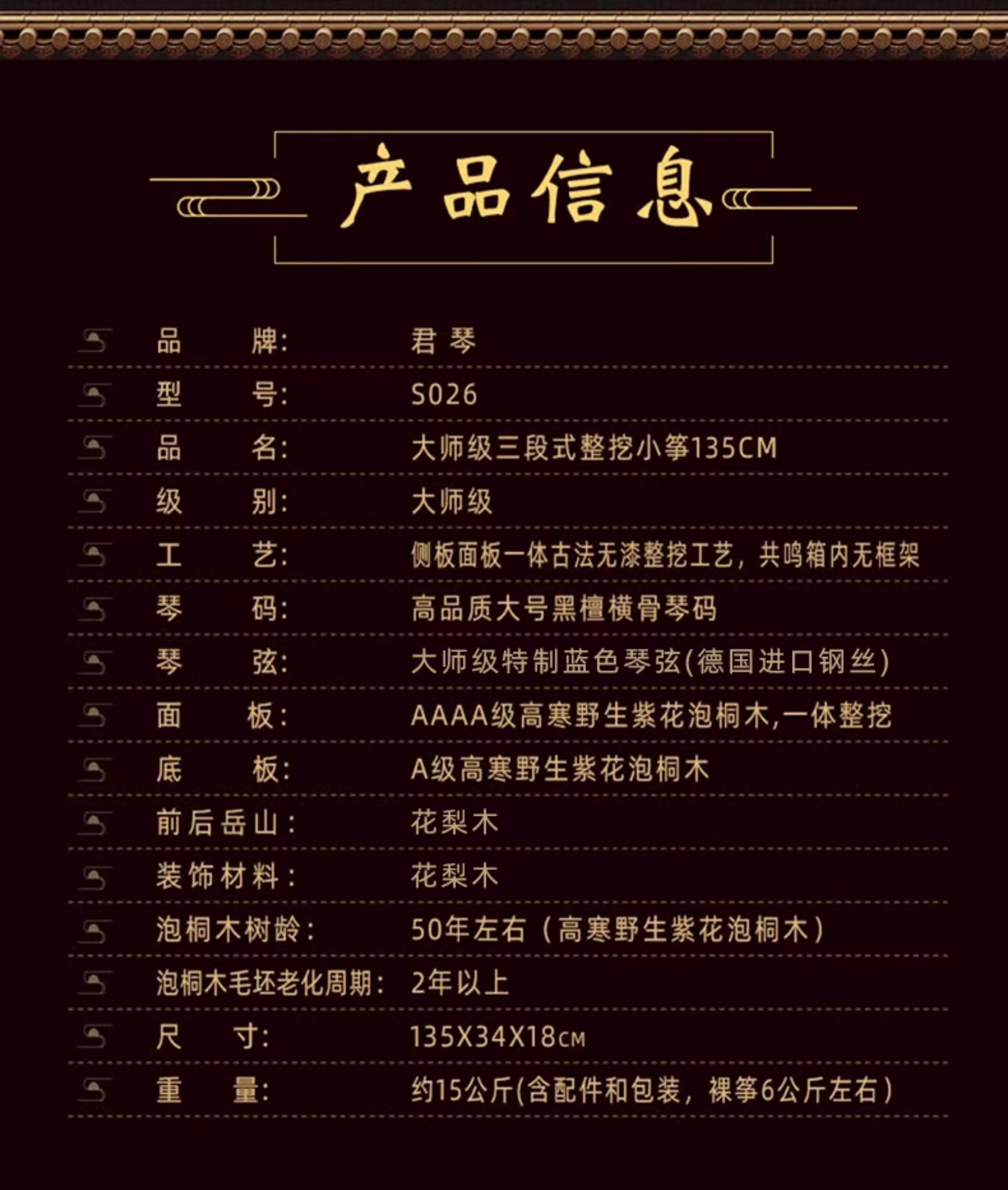 商品名称:君琴古筝大师级整挖1.35米小古筝便携短筝可传承整挖古筝S026闻道