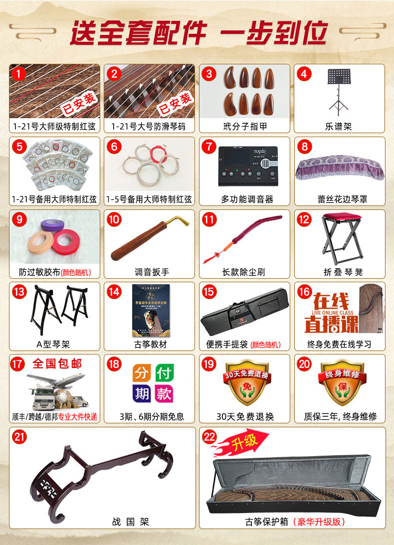 古筝很漂亮,调音有老师指导,也很方便简单,琴音很好听,悦耳,物流很快速,送货上门,服务到位,配送的物品很齐全,还有线上课程,值得推荐