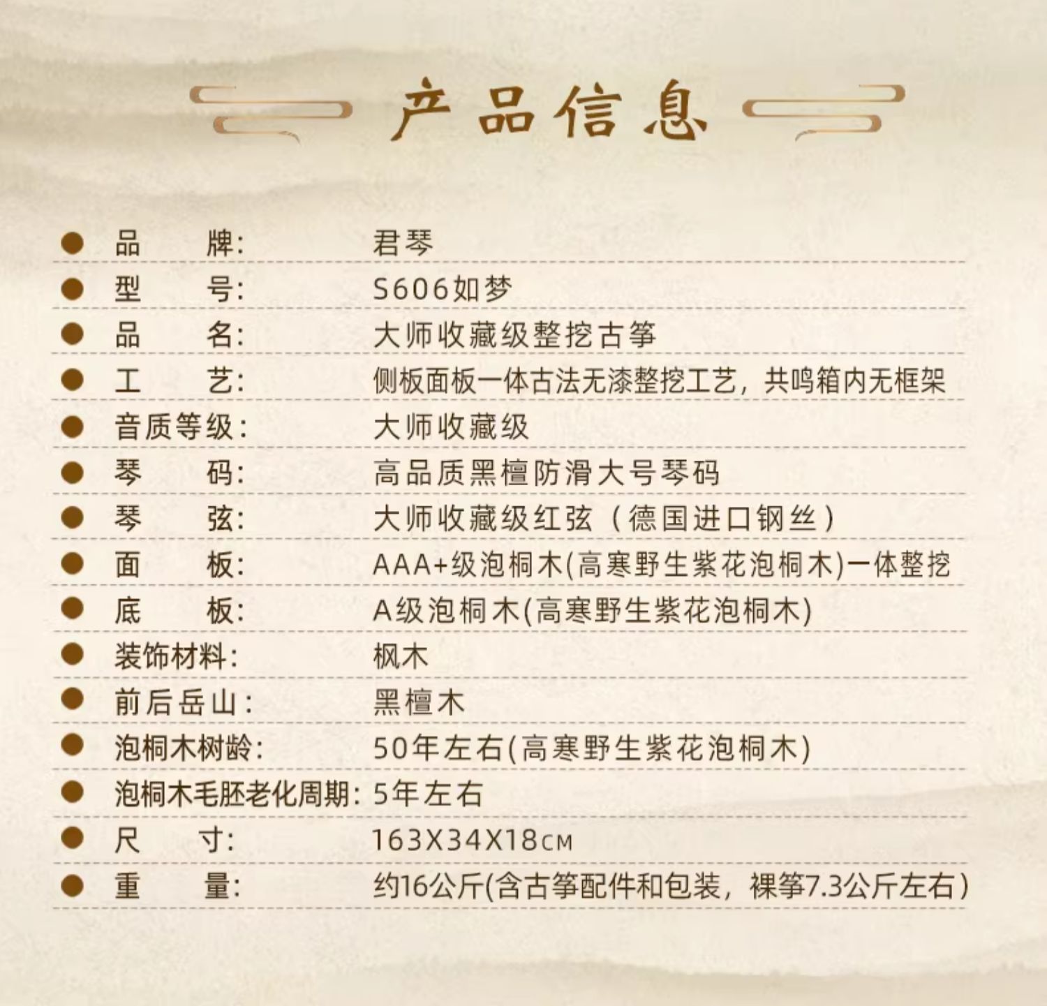 商品名称:君琴古筝学院款大师收藏级整挖古筝枫木实木专业演奏筝琴S606如梦