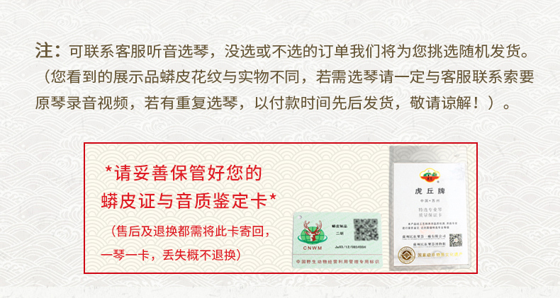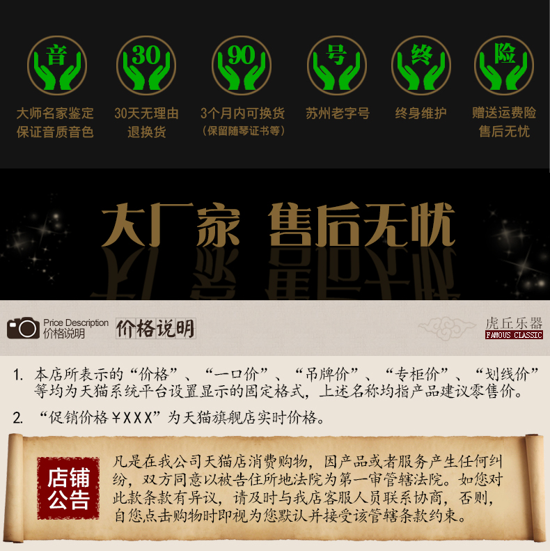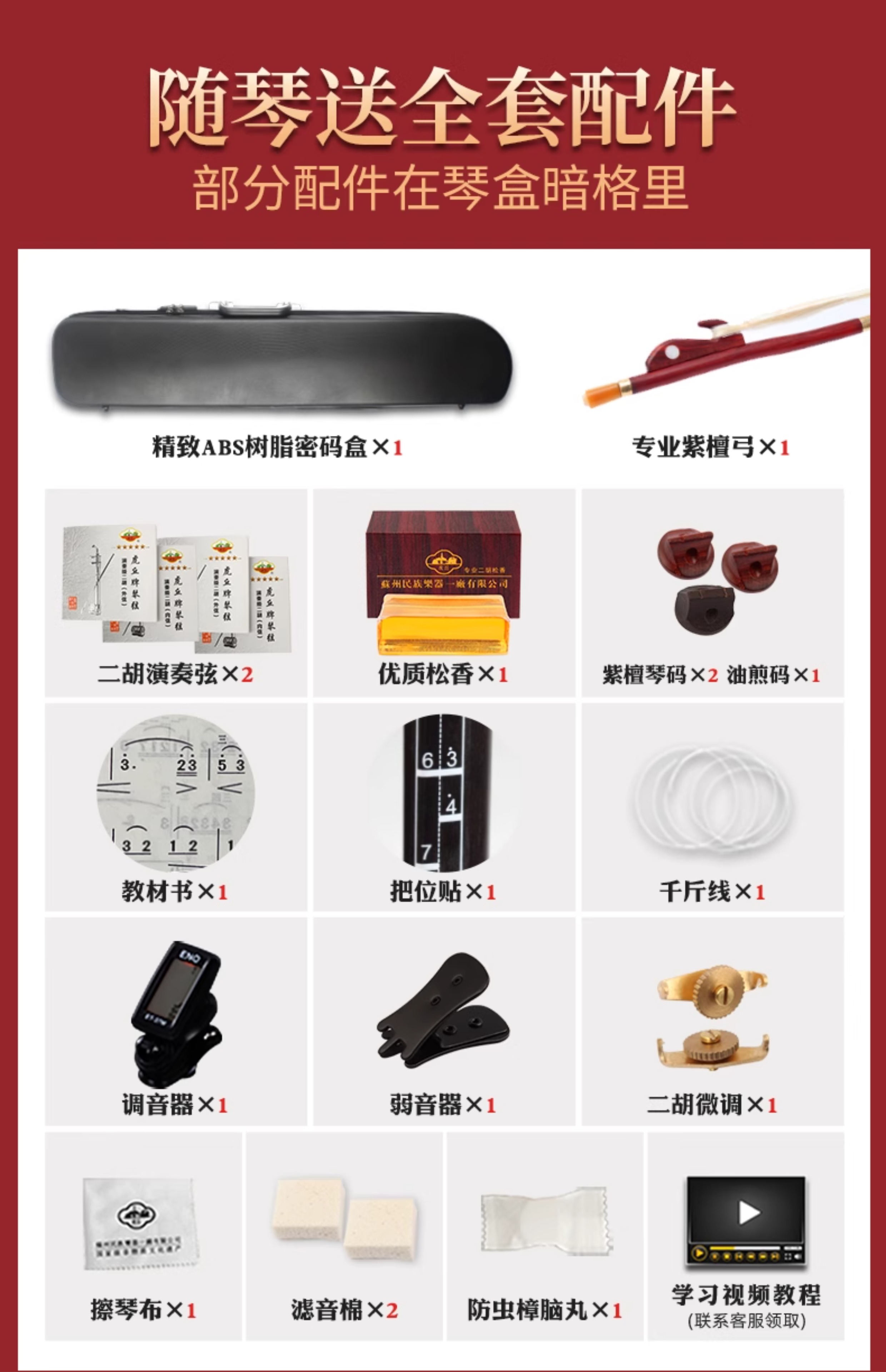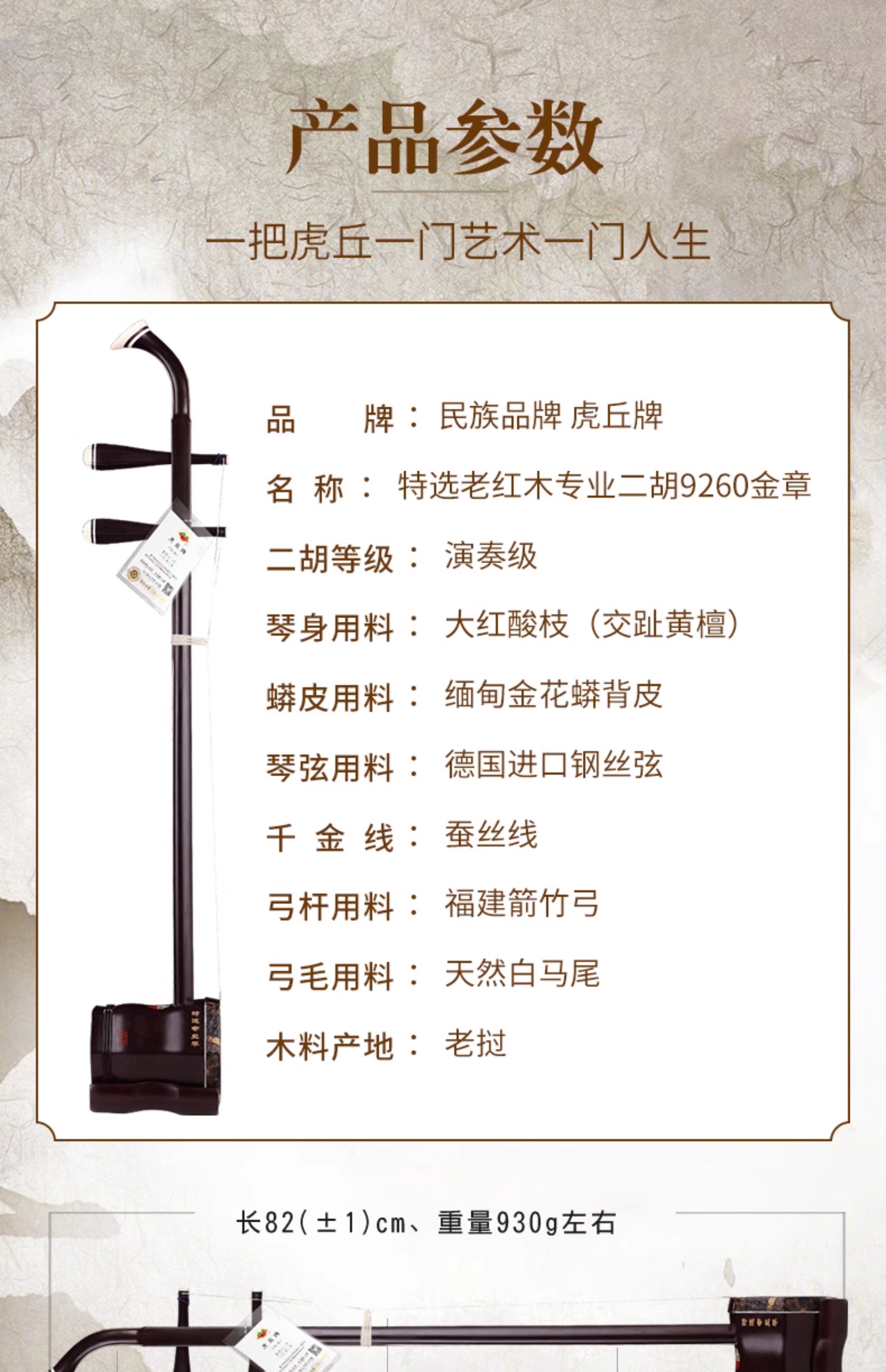 买虎丘二胡放一百二十个心,品牌就是品牌!从选购到视频试音,再到售后服务真的是让人爽歪歪,我还特别花了近二百元买了一个和虎丘二胡相匹配的二胡架,客服服务让上满意!琴盒带密码小孩也损不了二胡。