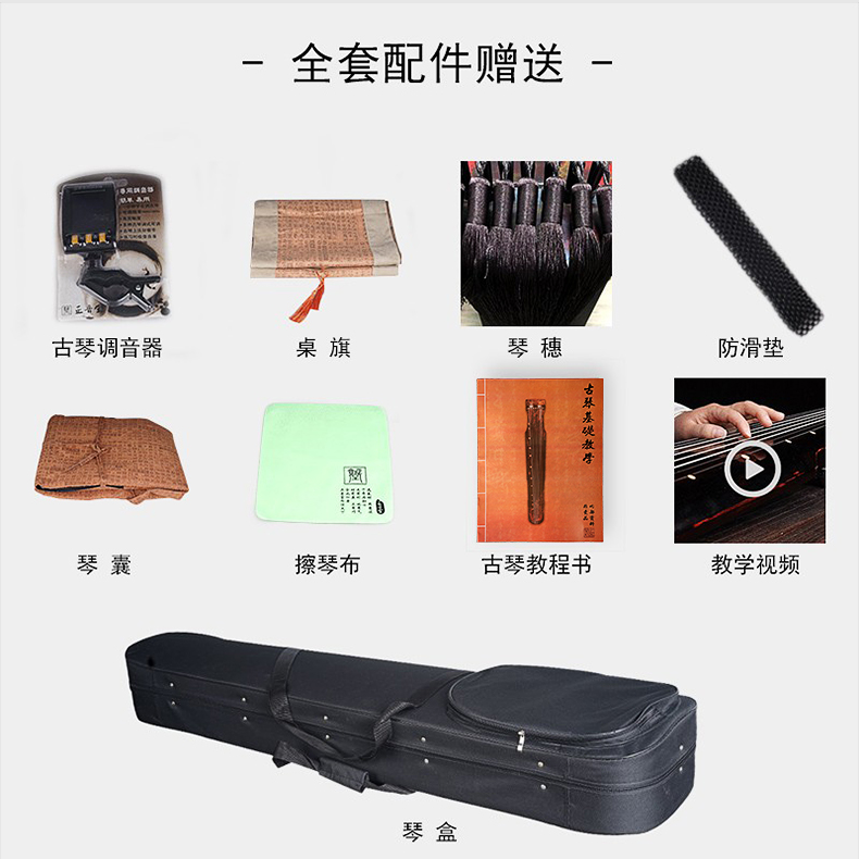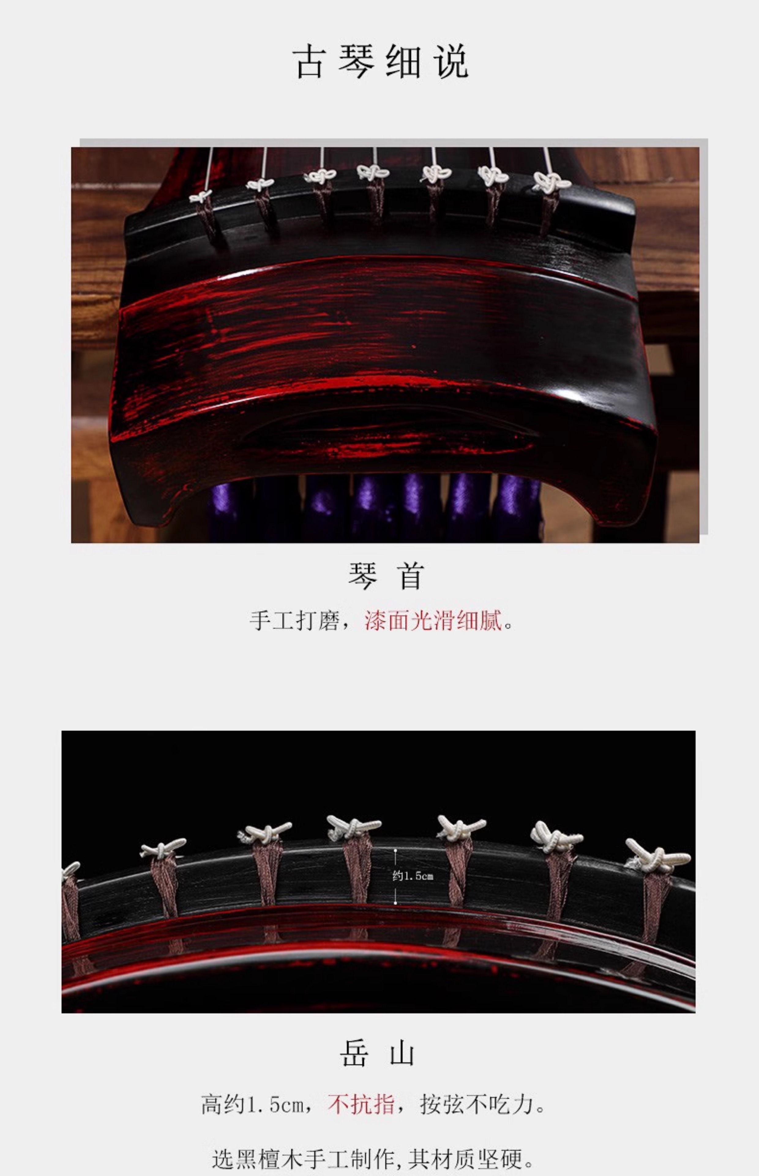 古琴很不错,试弹之后更是惊喜,音色纯净清透,泛音空灵悠远,如幽谷回响;按音圆润细腻,韵味悠长。轻抚琴弦,每一个音符都饱满动听,高低音过渡浑然天成。摆在书房里瞬间提升格调,从外观到音色都无可挑剔,完全超出预期,必须好评!