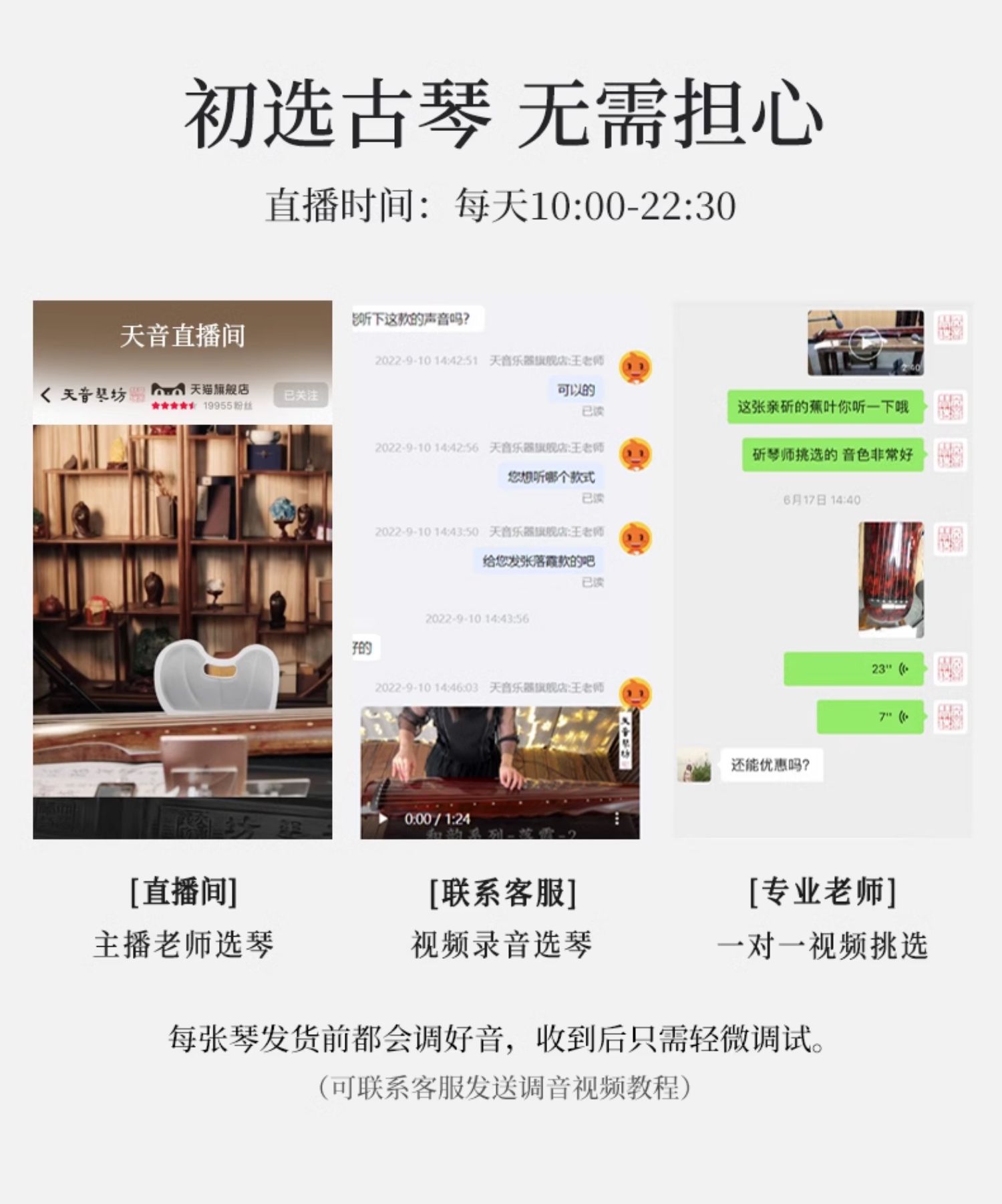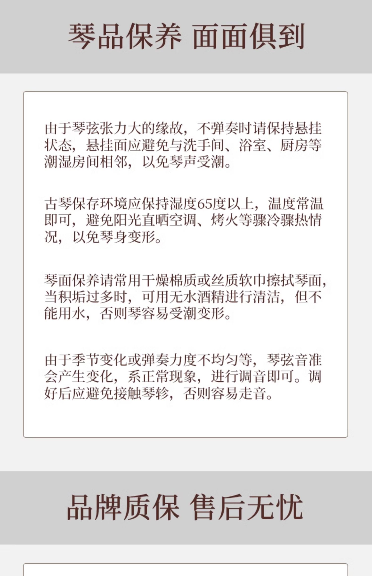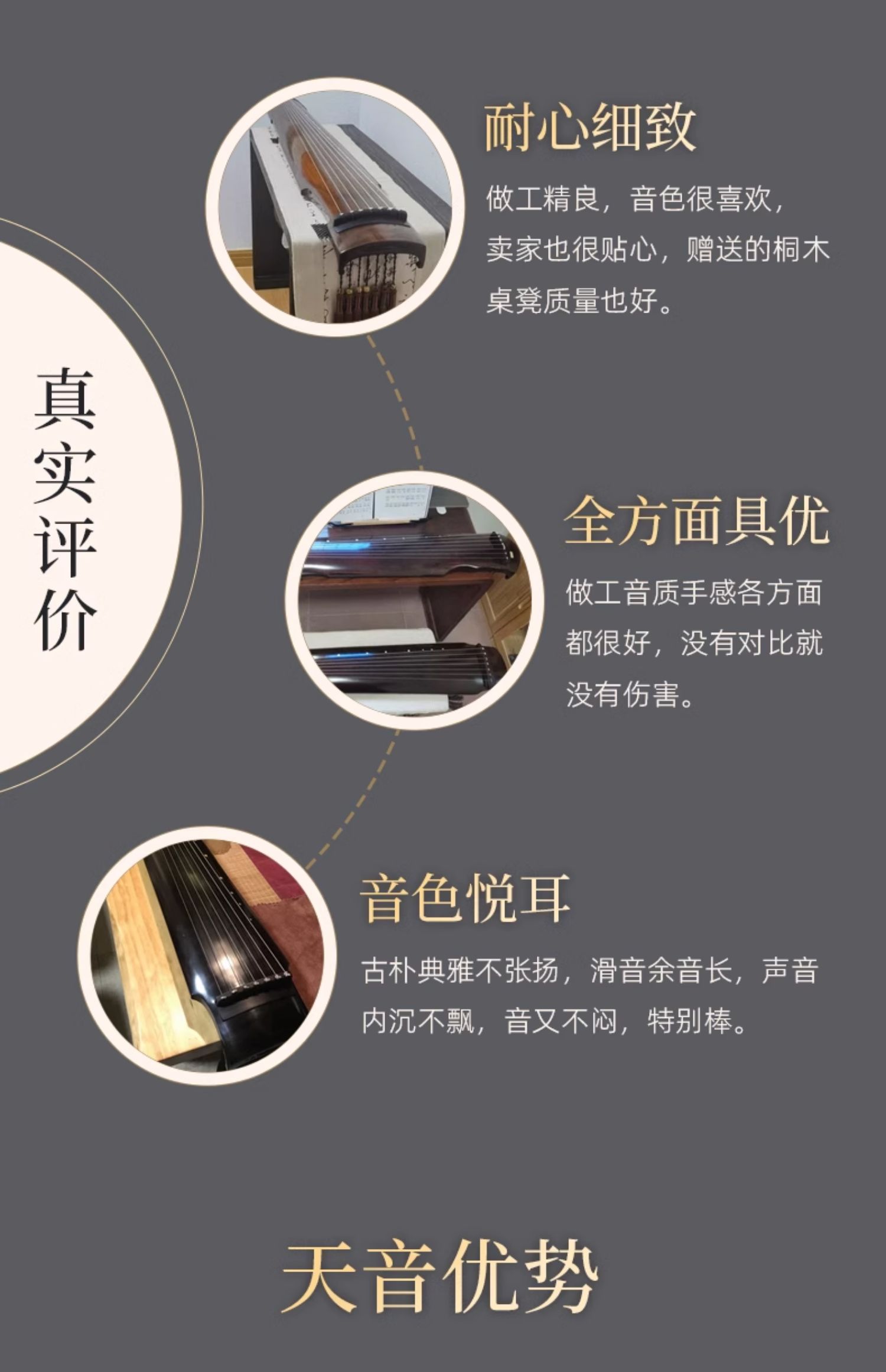 整体评价:优等 使用手感:无三病,弹了几天手感不错 声音音质:颗粒感很好,真如淙淙鸣泉 做工质量:漆面均匀温润 外观设计:大气,厚实,古朴,典雅 我是普通琴友,接触古琴好几年了,确定可以一生与琴为伴,所以才咬咬牙、下定决心选个好琴,毕竟好琴不便宜。朋友们买琴一定要根据自己的学习进度、喜欢程度和预算多少来挑选,不用一味追求最好的,因为永远有更好的更贵的琴,适合自己的就是最好的。只要喜欢,就算自己做一把不上漆的素琴也是足够用的,《老子》有云:知足不辱,知止不殆。对比了好几家,最终认为天音比较专业和有保障,在直播间选的琴,感谢梁老师的耐心讲解和仔细对比,客服小助理也很好,及时答复处理各种问题。另外,送的一体式琴桌很不错,包装特别完善。用的顺丰快递,一点没磕的把琴和桌椅送到了,还帮忙搬上楼,很满意。