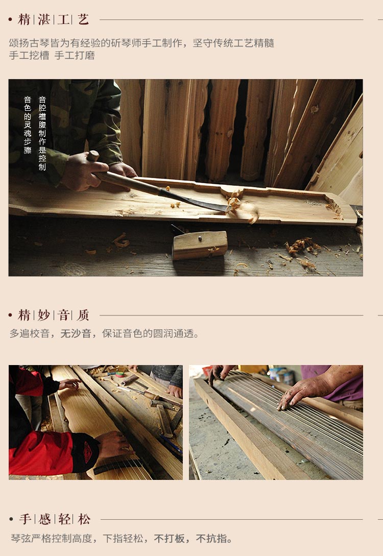 这张古琴的音色,清亮带有古朴的韵味,弹起来不费力,颜色黑中带枣红很好看,整体很满意,很实在工艺又好的琴行,值得推荐。